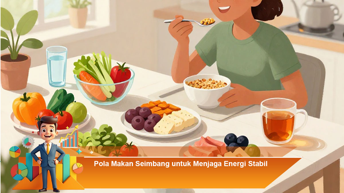 Pola makan seimbang terdiri dari karbohidrat kompleks, protein, lemak sehat, serat, vitamin, dan mineral. Karbohidrat kompleks dari sumber seperti gandum utuh, beras merah, dan oats memberikan energi bertahan lama. Protein dari daging tanpa lemak, ikan, telur, atau kacang-kacangan membantu memperbaiki sel dan membangun otot. Lemak sehat dari alpukat, kacang-kacangan, dan minyak zaitun mendukung fungsi saraf dan hormon. Serat dari sayuran dan buah-buahan membantu pencernaan tetap lancar serta mengurangi lonjakan gula darah. Vitamin dan mineral memastikan sistem imun dan metabolisme tubuh bekerja optimal. Kombinasi ini membuat energi tubuh tetap stabil dan mencegah rasa lapar berlebihan di antara waktu makan.